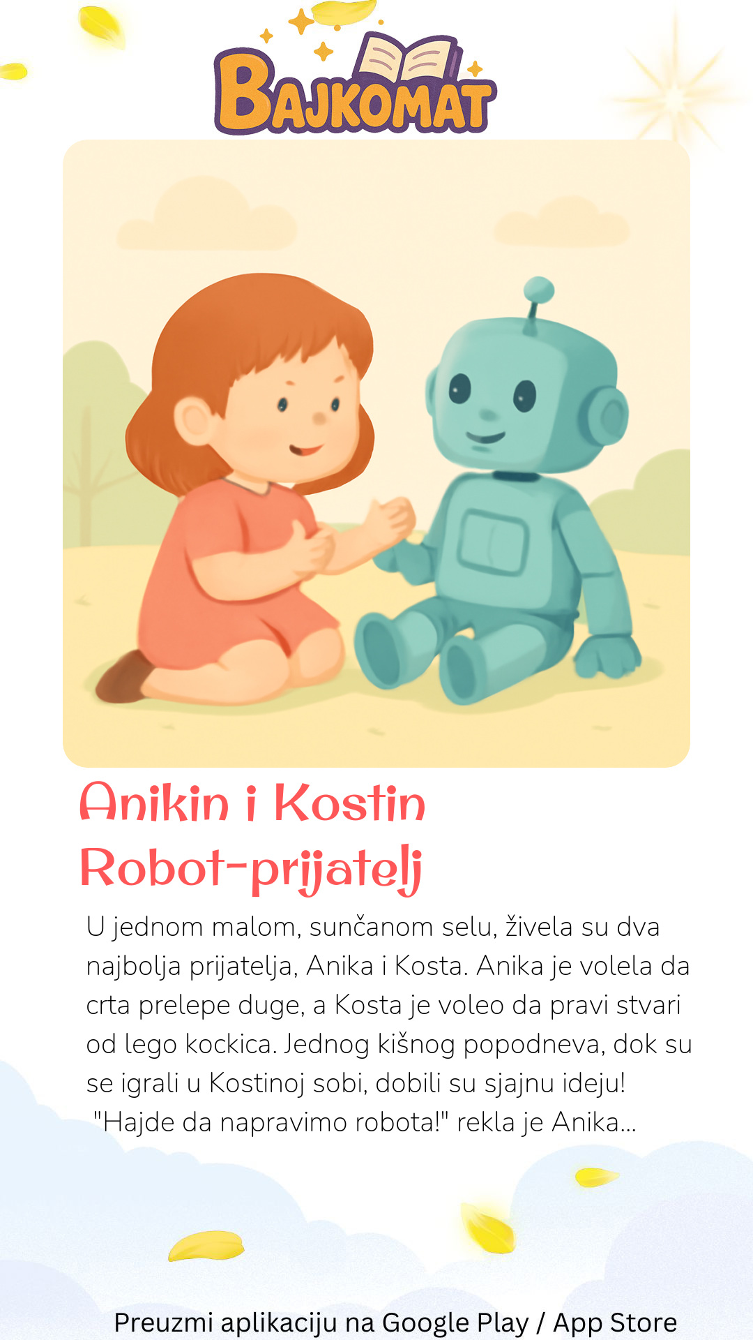 U jednom malom, sunčanom selu, živela su dva najbolja prijatelja, Anika i Kosta. Anika je volela da crta prelepe duge, a Kosta je voleo da pravi stvari od lego kockica. Jednog kišnog popodneva, dok su se igrali u Kostinoj sobi, dobili su sjajnu ideju! "Hajde da napravimo robota!" rekla je Anika, a oči su joj svetlucale od uzbuđenja. "Da!" Kosta se složio, "Robota koji nam može pomoći!" Krenuli su na posao. Koristili su veliku kartonsku kutiju za telo, stare CD-ove za sjajne oči, i rolne toalet papira za ruke i noge. Anika je ofarbala robota u jarke boje – crvenu, žutu i plavu – a Kosta je pričvrstio šarene žice koje su ličile na dugmiće. Kada su završili, stajao je pred njima veliki, šareni robot! Nije se pomerao, ali je izgledao veoma prijateljski. "Kako ćemo ga nazvati?" pitala je Anika. "Zvaće se Zujica", rekao je Kosta, "jer će zujati od sreće kada nam pomaže." Sledećeg dana, sunce je ponovo zasjalo, a Anika i Kosta su izneli Zujicu napolje u svoje dvorište. Zamišljali su kako Zujica čisti njihove igračke, zaliva cveće i čak pomaže majci da spremi večeru. Smejali su se dok su se pretvarali. Dok su se igrali, Anikina mala plišana igračka, zečić Skočić, slučajno je odleteo i sleteo na visoku granu drveta. "Oh, ne!" uzdahnula je Anika. Kosta je pogledao Zujicu. "Kad bi Zujica mogao da se popne i dohvati Skočića!" Iako Zujica nije mogao da se kreće sam, Anika i Kosta su dobili novu ideju. Pažljivo su podigli Zujicu i postavili ga ispod grane. Zatim su se popeli na veliku, čvrstu kutiju pored Zujice, i Kosta je mogao da dohvati Skočića sa grane! "Uspeli smo, Zujice!" Anika je aplaudirala. Robot Zujica je možda bio napravljen od kutija i CD-ova, ali je bio njihov najbolji prijatelj i uvek im je pomagao da razmišljaju kreativno. Anika i Kosta su znali da će uz malo mašte i timskog rada, uvek pronaći rešenje za bilo koji problem.