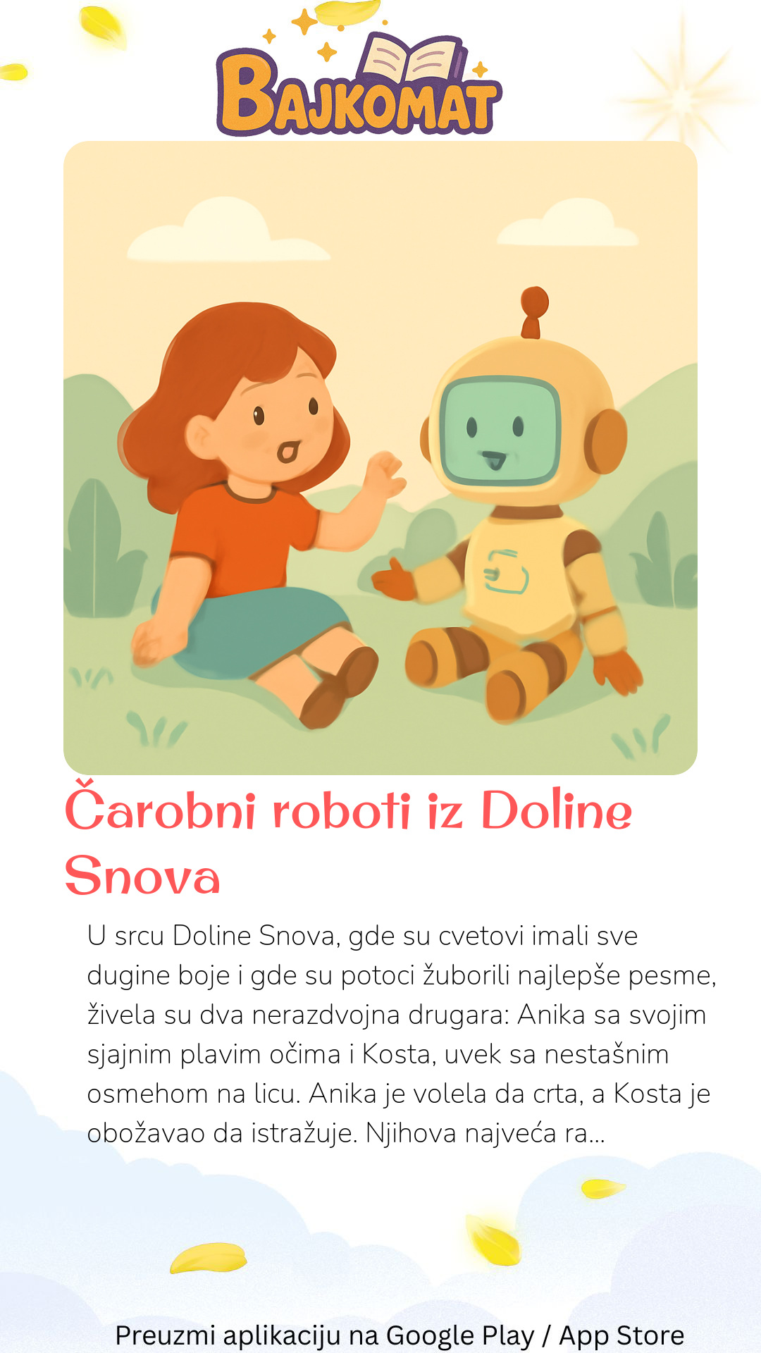 U srcu Doline Snova, gde su cvetovi imali sve dugine boje i gde su potoci žuborili najlepše pesme, živela su dva nerazdvojna drugara: Anika sa svojim sjajnim plavim očima i Kosta, uvek sa nestašnim osmehom na licu. Anika je volela da crta, a Kosta je obožavao da istražuje. Njihova najveća radost bile su priče o drevnim, čarobnim robotima koji su navodno živeli duboko u šumi. Jednog sunčanog jutra, dok su skupljali sjajne kamenčiće pored reke, Anika je ugledala nešto što se presijavalo među lišćem. "Kosta, pogledaj!" povikala je, pokazujući prstom. Kosta, uvek spreman za avanturu, odmah je potrčao. Tamo, skrivena ispod starog hrasta, stajala je mala, metalna kutija. Kada su je pažljivo otvorili, unutra su pronašli blistavi, crveni ključ i staru mapu sa zvezdicom koja je pokazivala ka „Planini Smeha“. Srce im je brže zakucalo. Mogli su da osete da je ovo početak nečeg posebnog. Pratili su mapu, prolazeći kroz šumu punu cveća koje je mirisalo na med i kroz livade gde su skakutali veseli zečevi. Na vrhu Planine Smeha, otkrili su pećinu čiji je ulaz bio u obliku osmeha. Unutra, umesto strašnih zveri, čekalo ih je iznenađenje! Pred njima je stajalo pet malih, šarenih robota. Jedan je bio plav i zviždao je vesele melodije, drugi je bio zelen i plesao je smešne plesove, treći je bio žut i svetlucao je kao sunce, četvrti je bio roze i delio je meke zagrljaje, a peti, najmanji, bio je ljubičast i ispuštao je zvukove zvončića. Oni su bili čuvari sreće u Dolini Snova! Roboti su se aktivirali pomoću crvenog ključa, a kada su se pokrenuli, cela pećina je odjekivala od radosnih zvukova. Anika i Kosta su proveli ostatak dana igrajući se sa novim prijateljima. Plavi robot ih je učio vesele pesme, zeleni ih je zasmejavao svojim plesom, žuti im je pokazivao put svetleći u mraku, roze im je davao najslađe zagrljaje, a ljubičasti je svojim zvončićima najavljivao dolazak novih avantura. Shvatili su da su ovi roboti tu da šire radost i smeh. Od tog dana, Anika i Kosta su redovno posećivali svoje robotske prijatelje, donoseći sreću svakom kutku Doline Snova.