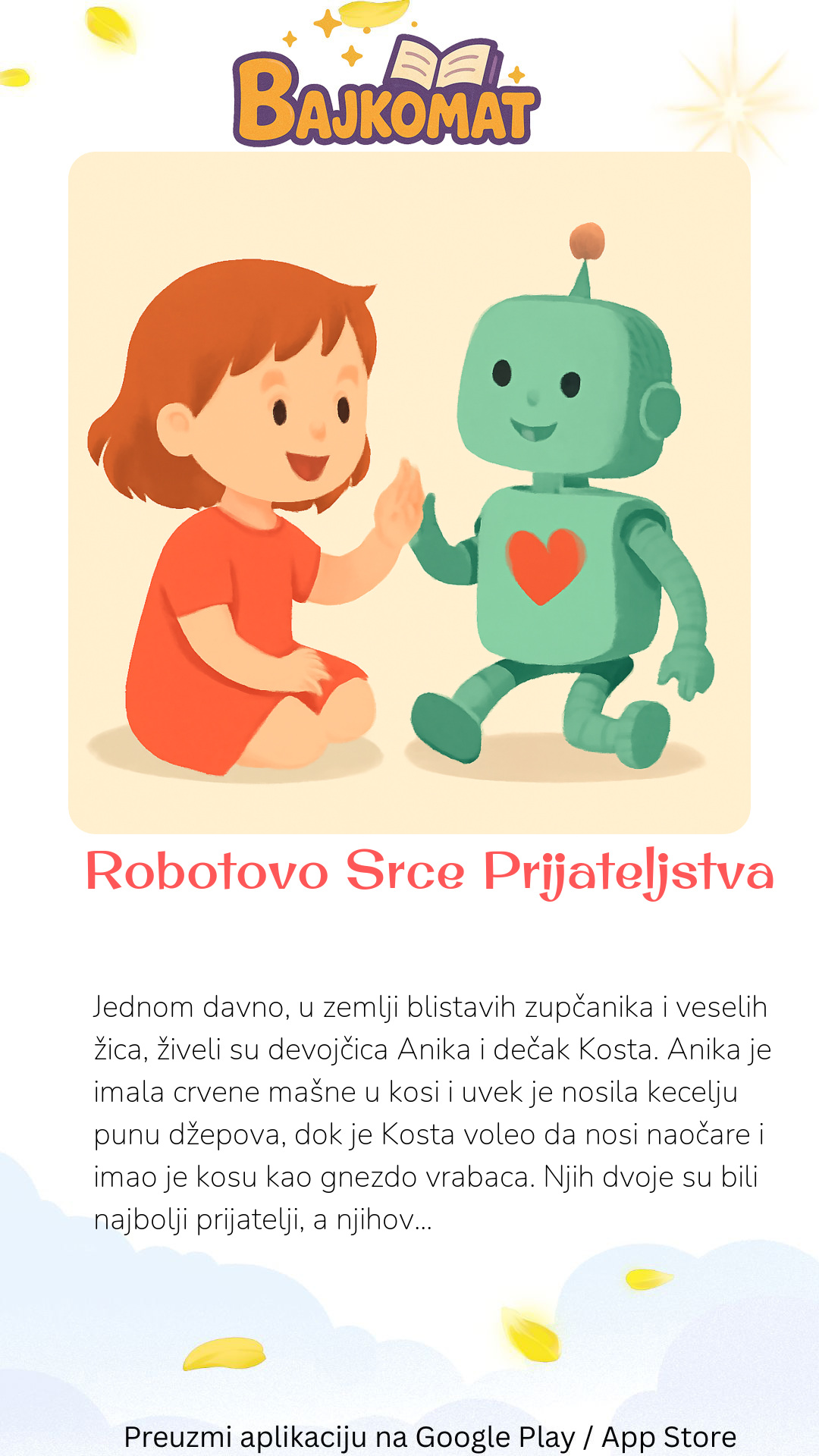 Jednom davno, u zemlji blistavih zupčanika i veselih žica, živeli su devojčica Anika i dečak Kosta. Anika je imala crvene mašne u kosi i uvek je nosila kecelju punu džepova, dok je Kosta voleo da nosi naočare i imao je kosu kao gnezdo vrabaca. Njih dvoje su bili najbolji prijatelji, a njihova najveća radost bio je robot po imenu Boto. Boto nije bio običan robot. Imao je velike, sjajne oči koje su svetlele nežnom plavom bojom i smeškao se skoro uvek. Nije bio previše spretan, često bi se sapleo o sopstvene noge, ali je zato bio majstor za priče i pesmice. Svakog jutra, Anika i Kosta su trčali u radionicu da probude Bota. "Dobro jutro, Boto!" viknuli bi uglas. Boto bi zaškripao, zatim bi mu se upalile lampice i rekao bi: "Dobro jutro, moji mali inženjeri! Jesmo li spremni za nova otkrića danas?" Jednog sunčanog popodneva, dok su se igrali u radionici, Kosta je primetio da Boto deluje malo tužno. Njegove oči nisu svetlele tako sjajno, a pesmice su bile tiše. "Šta ti je, Boto?" upitala je Anika, zagledajući ga. "Mislim da mi nedostaje nešto važno," reče Boto, "nešto što me čini još radosnijim." Anika i Kosta su se pogledali. Znali su da Boto ima sve žice i čipove, ali šta bi mu moglo nedostajati? "Hajde da razmislimo," rekao je Kosta, "šta nas čini srećnim?" "Prijateljstvo!" viknula je Anika. "I zagrljaji! I smeh!" Tada su dobili ideju! Anika je uzela papir i šarene bojice, a Kosta je našao sjajne dugmiće i meku vunu. Počeli su da prave nešto posebno. Anika je nacrtala veliko, crveno srce, a Kosta ga je pažljivo izrezao. Potom su ga oblepili vunicom i dugmićima, čineći ga mekim i toplim. "Boto," rekla je Anika, pružajući mu svoje remek-delo. "Ovo je tvoje novo srce. Srce prijateljstva, puno ljubavi i radosti!" Kosta je nežno pričvrstio srce na Botoove grudi. Odmah, Botoove oči su zasvetlele jače nego ikada! Počeo je da peva najveseliju pesmicu koju su ikada čuli, a onda je nespretno zagrlio Aniku i Kostu. "Ovo je najlepše srce na svetu!" rekao je Boto. "Sada sam potpun!" Od tog dana, Boto je bio najveseliji robot u celoj zemlji zupčanika, uvek sa svojim srcem prijateljstva, koje je podsećalo sve na snagu ljubavi i smeha.