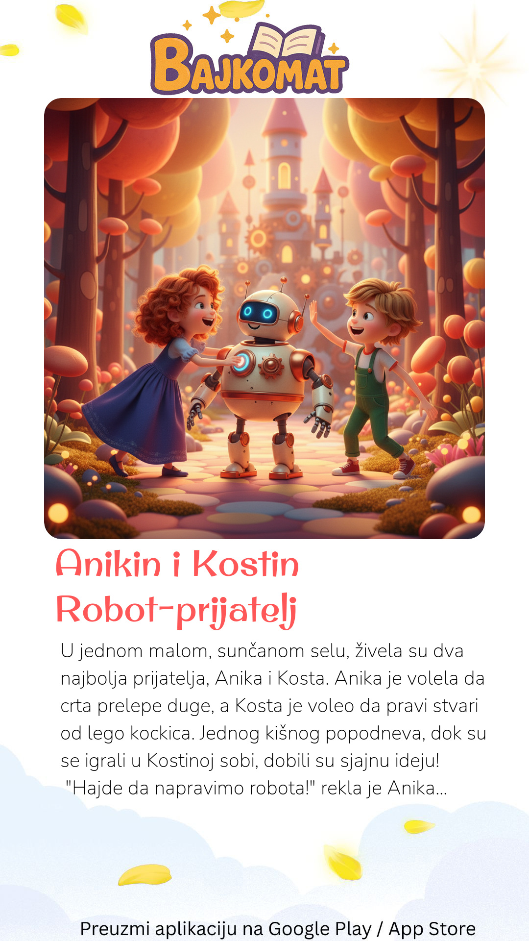 U jednom malom, sunčanom selu, živela su dva najbolja prijatelja, Anika i Kosta. Anika je volela da crta prelepe duge, a Kosta je voleo da pravi stvari od lego kockica. Jednog kišnog popodneva, dok su se igrali u Kostinoj sobi, dobili su sjajnu ideju! "Hajde da napravimo robota!" rekla je Anika, a oči su joj svetlucale od uzbuđenja. "Da!" Kosta se složio, "Robota koji nam može pomoći!" Krenuli su na posao. Koristili su veliku kartonsku kutiju za telo, stare CD-ove za sjajne oči, i rolne toalet papira za ruke i noge. Anika je ofarbala robota u jarke boje – crvenu, žutu i plavu – a Kosta je pričvrstio šarene žice koje su ličile na dugmiće. Kada su završili, stajao je pred njima veliki, šareni robot! Nije se pomerao, ali je izgledao veoma prijateljski. "Kako ćemo ga nazvati?" pitala je Anika. "Zvaće se Zujica", rekao je Kosta, "jer će zujati od sreće kada nam pomaže." Sledećeg dana, sunce je ponovo zasjalo, a Anika i Kosta su izneli Zujicu napolje u svoje dvorište. Zamišljali su kako Zujica čisti njihove igračke, zaliva cveće i čak pomaže majci da spremi večeru. Smejali su se dok su se pretvarali. Dok su se igrali, Anikina mala plišana igračka, zečić Skočić, slučajno je odleteo i sleteo na visoku granu drveta. "Oh, ne!" uzdahnula je Anika. Kosta je pogledao Zujicu. "Kad bi Zujica mogao da se popne i dohvati Skočića!" Iako Zujica nije mogao da se kreće sam, Anika i Kosta su dobili novu ideju. Pažljivo su podigli Zujicu i postavili ga ispod grane. Zatim su se popeli na veliku, čvrstu kutiju pored Zujice, i Kosta je mogao da dohvati Skočića sa grane! "Uspeli smo, Zujice!" Anika je aplaudirala. Robot Zujica je možda bio napravljen od kutija i CD-ova, ali je bio njihov najbolji prijatelj i uvek im je pomagao da razmišljaju kreativno. Anika i Kosta su znali da će uz malo mašte i timskog rada, uvek pronaći rešenje za bilo koji problem.
