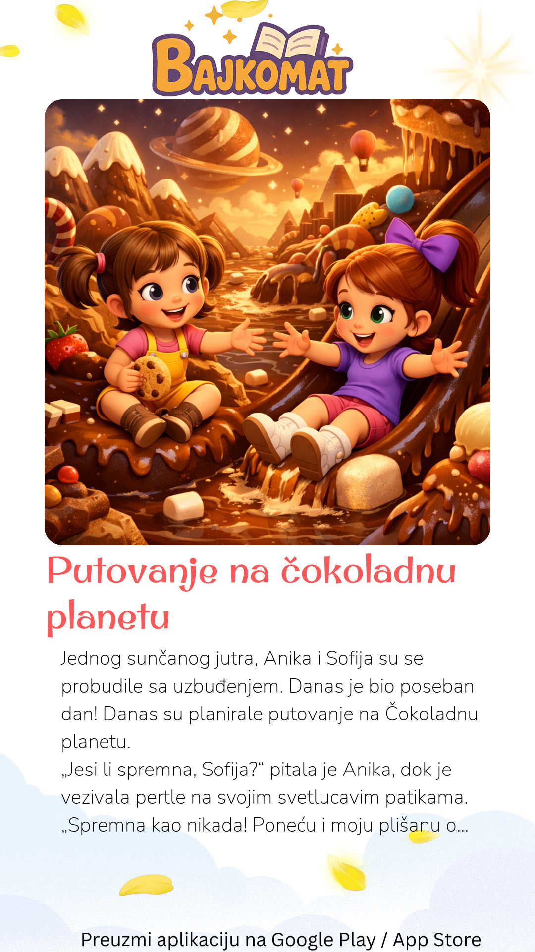 Jednog sunčanog jutra, Anika i Sofija su se probudile sa uzbuđenjem. Danas je bio poseban dan! Danas su planirale putovanje na Čokoladnu planetu. „Jesi li spremna, Sofija?“ pitala je Anika, dok je vezivala pertle na svojim svetlucavim patikama. „Spremna kao nikada! Poneću i moju plišanu ovčicu Belku,“ odgovorila je Sofija, grleći svoju omiljenu igračku. Njih dve su imale tajni leteći tepih, koji je mogao da ih odnese bilo gde. Prostrle su ga u dvorištu i popele se, čvrsto se držeći. „Čokoladna planeta, evo nas!“ povikala je Anika, a tepih je lagano poleteo. Putovale su kroz oblake, koji su izgledali kao veliki, beli šećerni oblačići. Anika i Sofija su se smejale dok su ih golicali po nosu. U daljini, ugledale su nešto neverovatno! Cela planeta je bila braon i sjajna. „Vidi, Anika! To je Čokoladna planeta!“ uzviknula je Sofija, pokazujući prstom. Sletele su lagano na meku, čokoladnu zemlju. Svuda oko njih su bili čokoladni potoci i drveće sa krošnjama od čokolade. „Možemo li da probamo?“ pitala je Anika, očiju sjajnih od čuda. „Naravno!“ rekla je Sofija, otkidajući mali komadić čokoladnog lista. Bio je tako ukusan! Šetale su po planeti, otkrivajući čokoladne pečurke i cveće od bele čokolade. Susrele su i male, veselo gnomove koji su pravili čokoladne bombone. Gnomovi su Aniki i Sofiji poklonili korpu punu najlepših čokoladnih poslastica. Predveče, kada je sunce počelo da zalazi, obasjavajući planetu zlatnim sjajem, Anika i Sofija su znale da je vreme da krenu kući. „Ovo je bilo najbolje putovanje ikada!“ rekla je Sofija, mašući gnomovima. „Da, i sada imamo čokoladu za celu nedelju!“ dodala je Anika, osmehujući se. Popele su se na svoj leteći tepih, sa korpom punom slatkiša i srcima punim uspomena. Zvezde su počele da svetlucaju dok su Anika i Sofija letela nazad u svoj krevet.