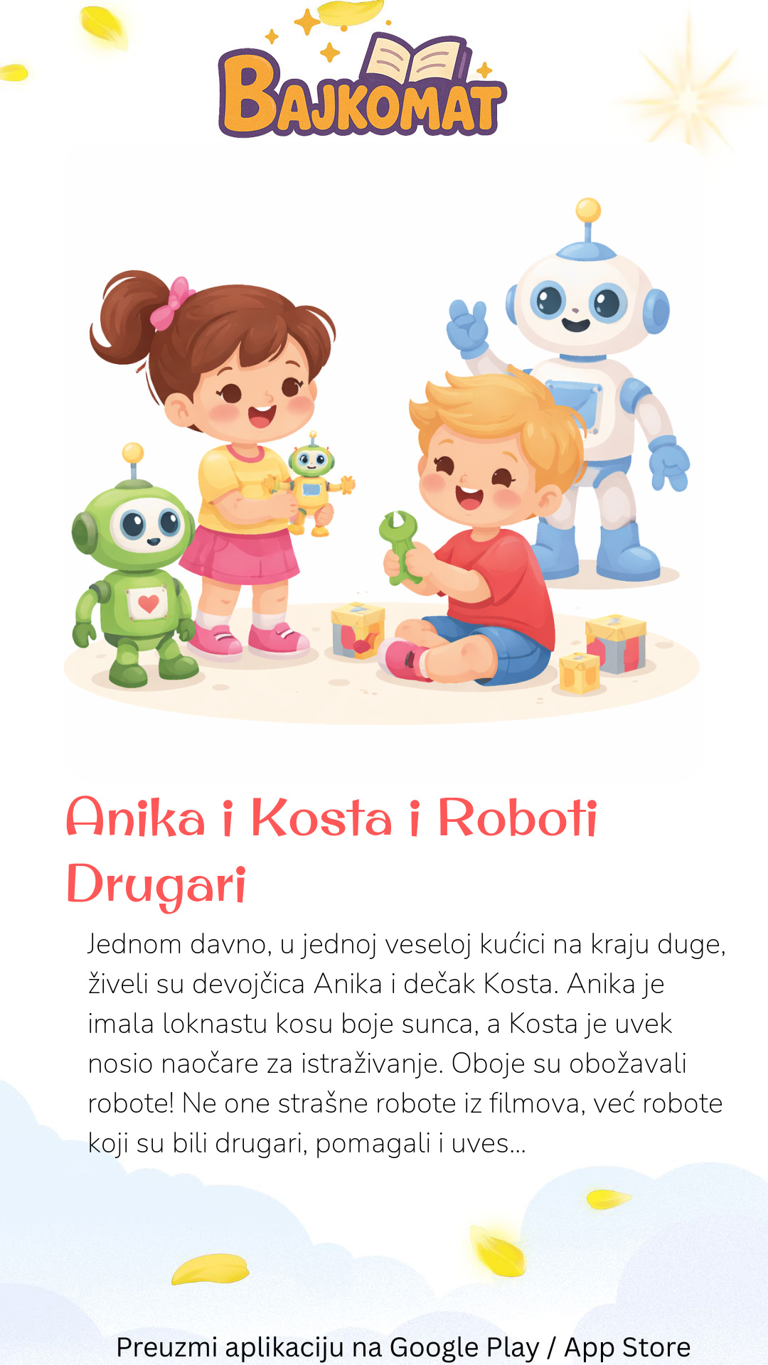 Jednom davno, u jednoj veseloj kućici na kraju duge, živeli su devojčica Anika i dečak Kosta. Anika je imala loknastu kosu boje sunca, a Kosta je uvek nosio naočare za istraživanje. Oboje su obožavali robote! Ne one strašne robote iz filmova, već robote koji su bili drugari, pomagali i uveseljavali. Jednog jutra, dok su Anika i Kosta doručkovali palačinke sa medom, Kosta je uzviknuo: „Anika, pogledaj! Stigla je nova kutija sa uputstvima za sklapanje robota!” Oči su im zasijale. Kutija je bila velika i sjajna, a unutra su bili delovi robota svih mogućih boja: crvene, plave, žute, zelene. „Hajde da ga sklopimo!”, rekla je Anika skačući sa stolice. Krenuli su u svoju radionicu, koja je zapravo bila njihova soba puna šarenih igračaka. Anika je pažljivo čitala uputstva, dok je Kosta tražio prave delove. „Anika, ovde piše da nam treba jedno okruglo dugme za stomak robota”, rekao je Kosta. Anika je pronašla dugme koje je izgledalo kao malo sunce. Zajedno su šrafili, spajali i pričali. Anika je držala delove, a Kosta ih je pažljivo montirao. Svaki deo koji su dodavali, robotić je postajao sve življi. Prvo su stavili nogice, pa trup, pa ručice koje su bile savitljive. Najviše su se smejali kada su stavljali glavu – imala je dva velika, znatiželjna oka. Kada su završili, pritisnuli su dugme na njegovim leđima. „Bip, bup, zdravo! Ja sam Robi! Hvala vam što ste me napravili!”, rekao je Robi svojim veselim, metalnim glasom. Anika i Kosta su skakali od sreće. Robi je bio najbolji drugar! Pomagao im je da skupe kocke posle igre, pevao im je smešne pesmice i čak ih je budio ujutru nežnim „bip, bup” zvukom. Jednog popodneva, dok su se igrali u dvorištu, Robi je primetio malu, uplašenu ptičicu koja je pala iz gnezda. „Bip, bup, ptičica treba pomoć!”, rekao je Robi. Anika i Kosta su pažljivo podigli ptičicu i vratili je u njeno gnezdo. „Robi, ti si zaista poseban robot”, rekla je Anika grleći Robija. „Da, Robi, ti si naš najbolji drugar”, dodao je Kosta. Robi je zasvetleo od sreće, a Anika i Kosta su znali da su napravili ne samo robota, već i pravog prijatelja.