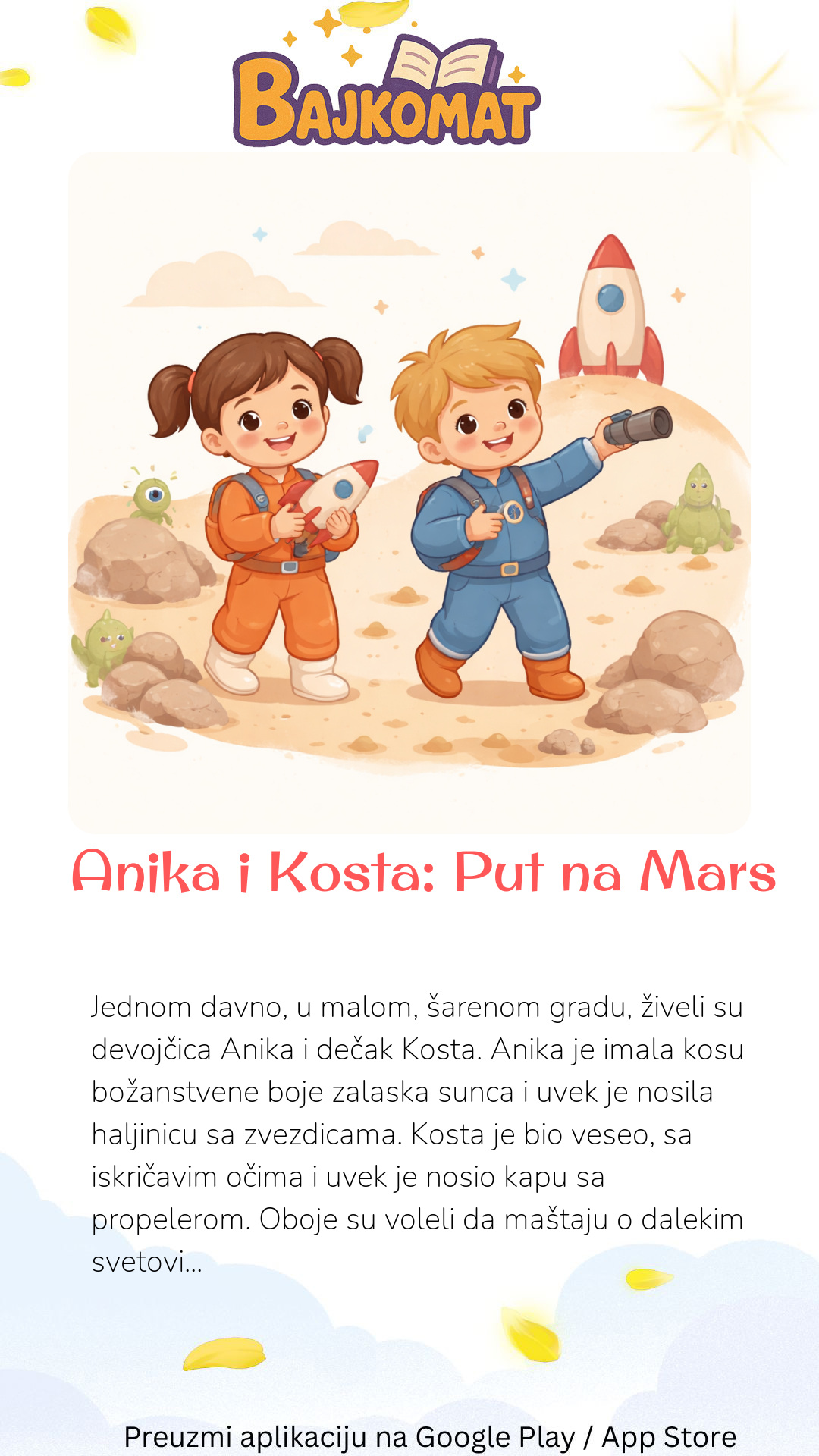 Jednom davno, u malom, šarenom gradu, živeli su devojčica Anika i dečak Kosta. Anika je imala kosu božanstvene boje zalaska sunca i uvek je nosila haljinicu sa zvezdicama. Kosta je bio veseo, sa iskričavim očima i uvek je nosio kapu sa propelerom. Oboje su voleli da maštaju o dalekim svetovima. Jedne vedre večeri, dok su sedeli u svom dvorištu i posmatrali nebo puno treperavih zvezda, Anika je uzdahnula: „Oh, Kosta, kako bih volela da posetim Mars!” Kosta, koji je uvek bio pun ideja, skočio je: „Pa, zašto ne bismo? Hajde da napravimo raketu!” Anika i Kosta su se bacili na posao. Korišćeli su kartonske kutije, jastuke za sedišta, i mnogo, mnogo šarenih flomastera. Kosta je nacrtao dugmiće za startovanje i kontrolu, a Anika je oslikala prozore kroz koje su se videle planete. Propeler sa Kostine kape postao je antena. „Naša raketa je spremna!” uzviknuo je Kosta kada su završili. Ušli su unutra, Anika je sedela na jednom jastuku, Kosta na drugom. Kosta je pritisnuo imaginarno dugme i izgovorio: „Pet, četiri, tri, dva, jedan... poletanje!” Njihova kartonska raketa je poskočila, a onda su Anika i Kosta zatvorili oči i zamislili da su zaista krenuli na put. „Vidim Mesec!” rekla je Anika, otvarajući jedno oko. „A ja vidim Saturn sa njegovim prstenovima!” dodao je Kosta, mašući rukama. Putovanje je bilo ispunjeno smehom i uzbuđenjem. Prošli su pored blistavih zvezda, veselih komete koje su im namigivale i oblaka magline u duginim bojama. Konačno, Kosta je uzviknuo: „Stigli smo! Vidim crvenu prašinu i planine! To je Mars!” Raketa je nežno sletela, a oni su provirili kroz svoje oslikane prozore. Zamislili su da vide brda crvenog peska i mala zelena marsovska bića koja im mašu. Proveli su malo vremena istražujući, sakupljajući imaginarno marsijansko kamenje i smejući se. Kada je sunce počelo da zalazi, znali su da je vreme da se vrate kući. „Bio je to najbolji put na Mars ikada!” rekla je Anika, grleći svoju raketu. Kosta se složio. Vratili su se u svoje dvorište, puni lepih uspomena i obećanja da će sutra možda posetiti Jupiter ili neku drugu daleku planetu.