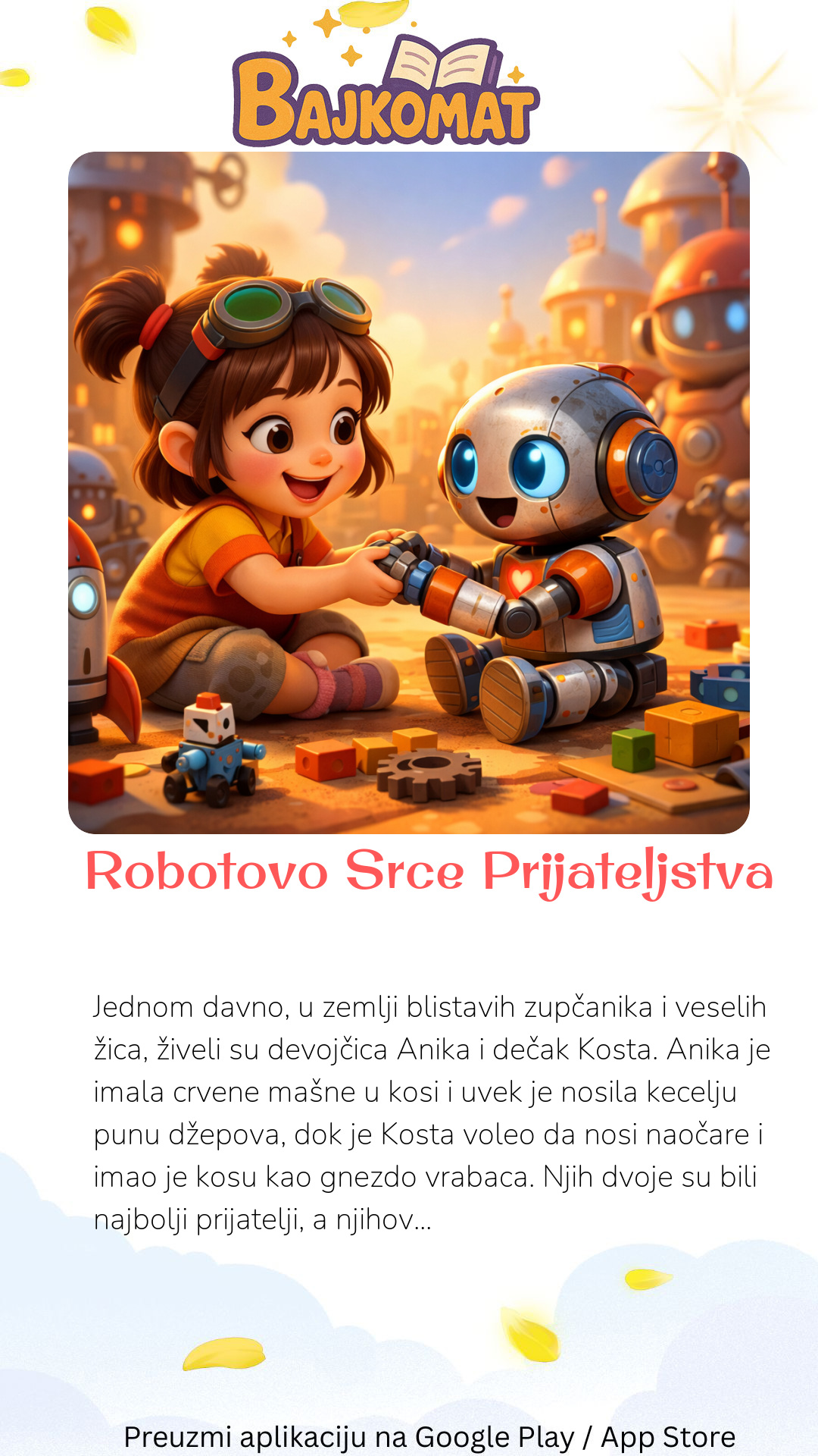 Jednom davno, u zemlji blistavih zupčanika i veselih žica, živeli su devojčica Anika i dečak Kosta. Anika je imala crvene mašne u kosi i uvek je nosila kecelju punu džepova, dok je Kosta voleo da nosi naočare i imao je kosu kao gnezdo vrabaca. Njih dvoje su bili najbolji prijatelji, a njihova najveća radost bio je robot po imenu Boto. Boto nije bio običan robot. Imao je velike, sjajne oči koje su svetlele nežnom plavom bojom i smeškao se skoro uvek. Nije bio previše spretan, često bi se sapleo o sopstvene noge, ali je zato bio majstor za priče i pesmice. Svakog jutra, Anika i Kosta su trčali u radionicu da probude Bota. "Dobro jutro, Boto!" viknuli bi uglas. Boto bi zaškripao, zatim bi mu se upalile lampice i rekao bi: "Dobro jutro, moji mali inženjeri! Jesmo li spremni za nova otkrića danas?" Jednog sunčanog popodneva, dok su se igrali u radionici, Kosta je primetio da Boto deluje malo tužno. Njegove oči nisu svetlele tako sjajno, a pesmice su bile tiše. "Šta ti je, Boto?" upitala je Anika, zagledajući ga. "Mislim da mi nedostaje nešto važno," reče Boto, "nešto što me čini još radosnijim." Anika i Kosta su se pogledali. Znali su da Boto ima sve žice i čipove, ali šta bi mu moglo nedostajati? "Hajde da razmislimo," rekao je Kosta, "šta nas čini srećnim?" "Prijateljstvo!" viknula je Anika. "I zagrljaji! I smeh!" Tada su dobili ideju! Anika je uzela papir i šarene bojice, a Kosta je našao sjajne dugmiće i meku vunu. Počeli su da prave nešto posebno. Anika je nacrtala veliko, crveno srce, a Kosta ga je pažljivo izrezao. Potom su ga oblepili vunicom i dugmićima, čineći ga mekim i toplim. "Boto," rekla je Anika, pružajući mu svoje remek-delo. "Ovo je tvoje novo srce. Srce prijateljstva, puno ljubavi i radosti!" Kosta je nežno pričvrstio srce na Botoove grudi. Odmah, Botoove oči su zasvetlele jače nego ikada! Počeo je da peva najveseliju pesmicu koju su ikada čuli, a onda je nespretno zagrlio Aniku i Kostu. "Ovo je najlepše srce na svetu!" rekao je Boto. "Sada sam potpun!" Od tog dana, Boto je bio najveseliji robot u celoj zemlji zupčanika, uvek sa svojim srcem prijateljstva, koje je podsećalo sve na snagu ljubavi i smeha.