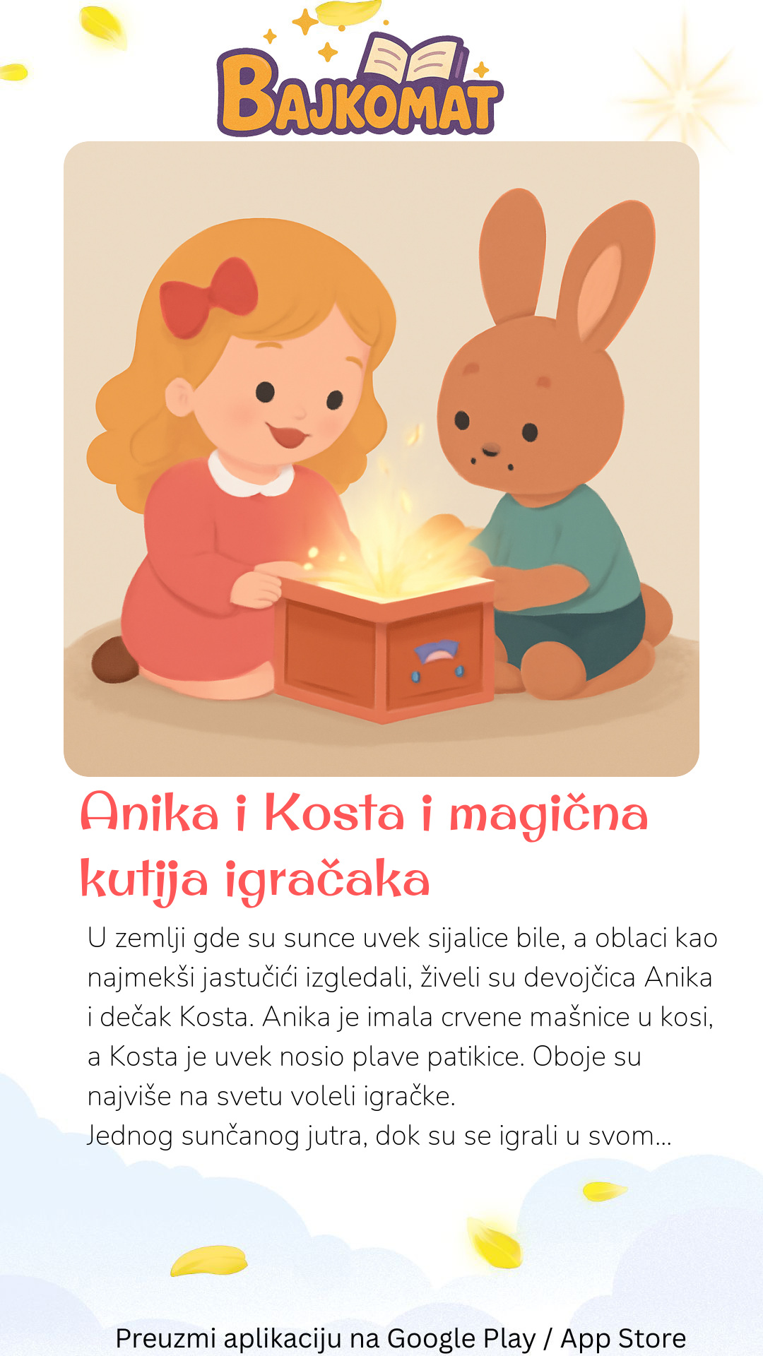 U zemlji gde su sunce uvek sijalice bile, a oblaci kao najmekši jastučići izgledali, živeli su devojčica Anika i dečak Kosta. Anika je imala crvene mašnice u kosi, a Kosta je uvek nosio plave patikice. Oboje su najviše na svetu voleli igračke. Jednog sunčanog jutra, dok su se igrali u svom dvorištu punom cveća koje je mirisalo na med, Anika je ugledala nešto neobično. Ispod starog drveta jabuke, tamo gde su obično spavale pčele, stajala je velika, drvena kutija. Kutija je bila ukrašena sjajnim zvezdicama i imala je ključić koji je izgledao kao mali cvet. „Vidi, Kosta!” uzviknula je Anika, a oči su joj zaiskrile od uzbuđenja. Kosta joj se pridružio i oboje su pažljivo posmatrali tajanstvenu kutiju. „Šta li je unutra?” šapnuo je Kosta. Pažljivo su otvorili kutiju cvetnim ključićem i, na njihovo veliko iznenađenje, unutra nije bilo samo nekoliko igračaka, već čitav jedan čarobni svet! Prvo su ugledali drvenog konjića koji je veselo galopirao po travi, pa zatim malu lutku koja je pevušila najlepše uspavanke. Tu je bio i plišani meda koji je znao da priča šale, i kockice koje su se same slagale u najviše kule. Anika je uzela lutku u naručje, a Kosta je zagrlio smešnog medu. Svaka igračka je imala svoju priču i svoju čaroliju. Meda je Kosti ispričao o dalekim planinama od sladoleda, a lutka je Aniki pokazala kako da stvara duge od balona od sapunice. Drveni konjić ih je poveo na imaginarno putovanje oko sveta, gde su videli polja puna lizalica i reke od čokolade. Anika i Kosta su shvatili da ova kutija nije samo puna igračaka, već i puna čarolije, mašte i beskrajne zabave. Obećali su da će deliti ove čarobne igračke sa svim svojim drugarima, kako bi svako dete moglo da iskusi radost i čaroliju koju su oni pronašli. Svaki dan je od tada bio nova avantura, ispunjena smehom i igrom.